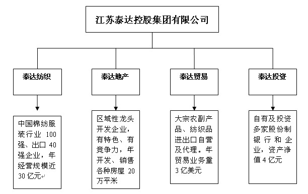 江蘇泰達控股集團有限公司是集紡織、房地產(chǎn)、進出口貿(mào)易、股權(quán)投資等多個行業(yè)為一體的私營綜合企業(yè)集團。多年來,公司堅持“以人為本,科學管理,不斷創(chuàng)新”的經(jīng)營理念,在業(yè)內(nèi)享有較高的聲譽。